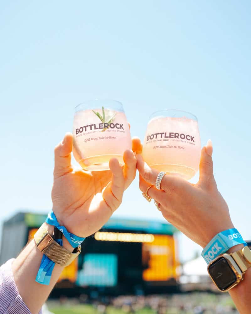 What should I bring to BottleRock? A reusable water bottle (empty at security), a hat, sunglasses, a jacket for nighttime, comfortable shoes, hand sanitizer, chapstick, and a portable phone charger. Be sure to check their bag policy, but generally they require your bag to be clear and no larger than 12″L x 6″W x 12″H. If it’s not a clear bag, it needs to be a small clutch or fanny pack (6″ x 9″ or smaller), with no more than one pocket. Backpacks are a no-go.