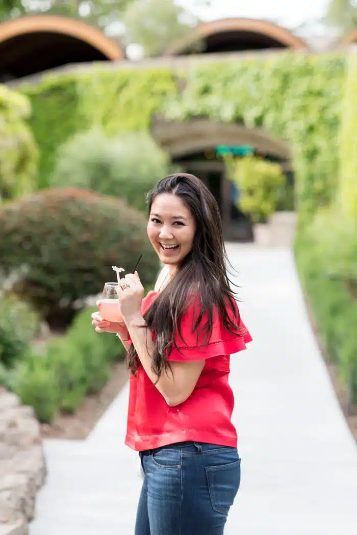 Earlier this spring we spent a day in Napa with my cousins and their hubbies. We lucked out and even though it had been raining that week, the Saturday that we spent in wine country was nothing but sunshine. So clearly, a brightly colored off-the-shoulder top was in order for the occasion. After a few different wineries, we ended the day at Domaine Chandon with some bubbly (and in my case, a champagne cocktail).