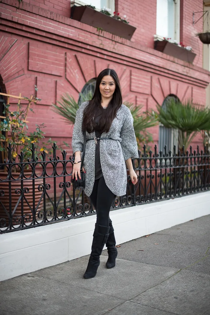 I loooove this cozy cocoon cardigan. Last seen in this outfit post, it’s been a repeat offender on the blog, my Insta feed, and lounging around at home. Dress it up or down, it’s got that cozy chic vibe that just won’t quit. In today’s outfit, which I wore over the weekend to brunch with some of my favorite bloggers, I belted it with a thin, navy belt, and I’m digging the effect it has and how it accentuates the waist (see another one of my favorite belting tricks in this outfit post).