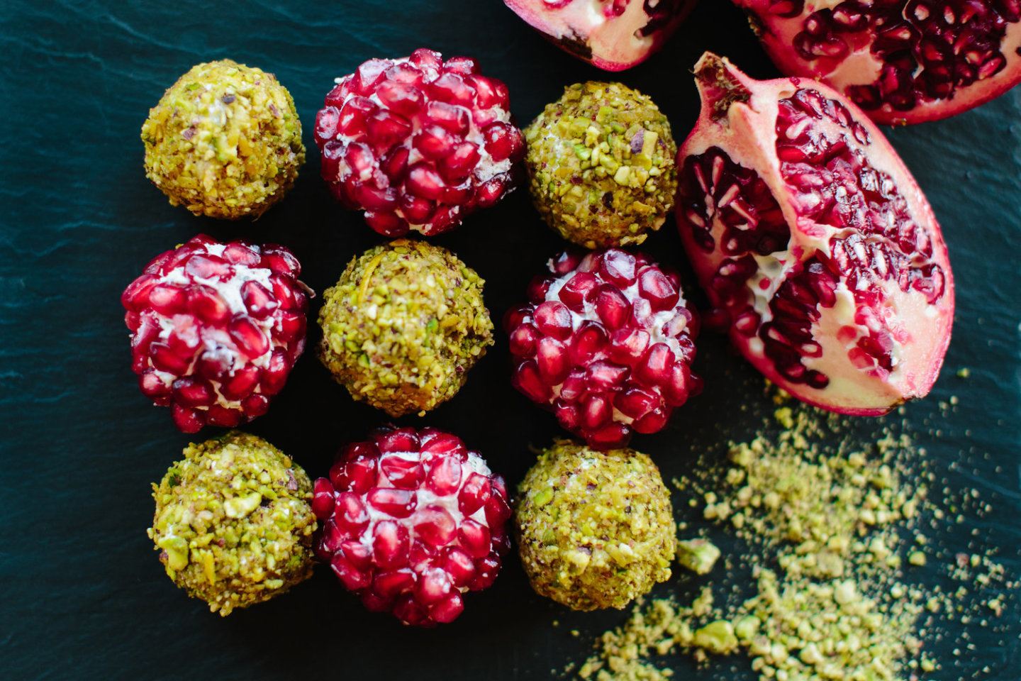 Remove the goat cheese from the refrigerator and roll 7 in pomegranate seeds and the other remaining 7 in the pistachio and lemon mixture to evenly coat the cheese balls.