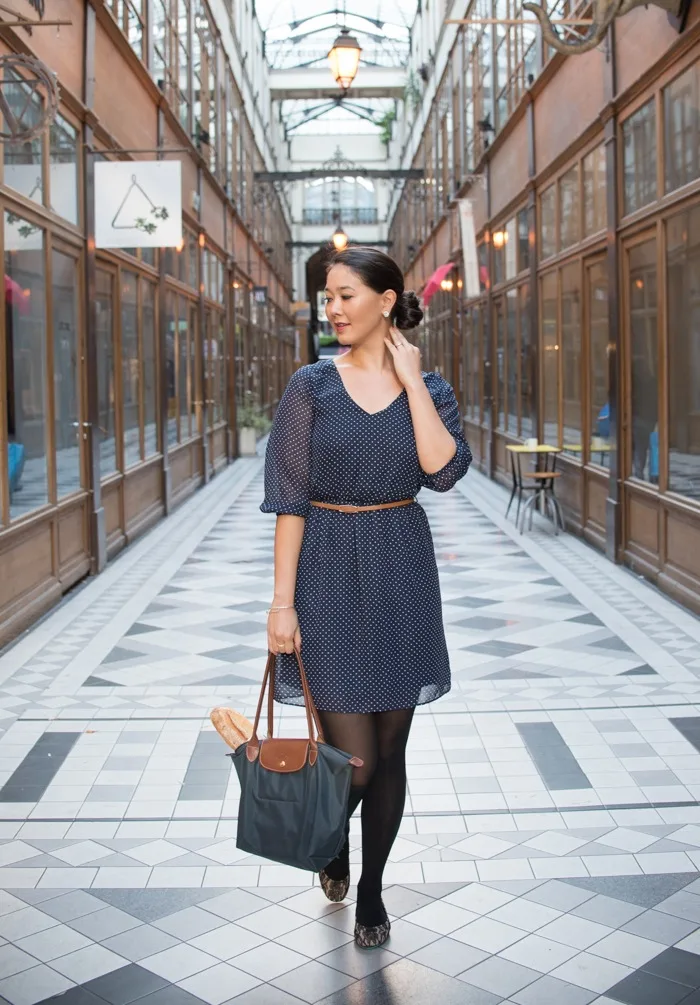 One of our favorite things to do in Paris was to stop by a boulangerie, patisserie, fromagerie, and a charcuterie to pick up some of their respective breads, sweets, cheeses and pâtés. We’d stuff everything in our bags, head out for some sight seeing, and then make our way to a park to enjoy our spread. For these types of outings, I wore a lot of outfits similar to this one. Comfortable dress + tights and a jacket for when it got chilly + a pair of cute flats.