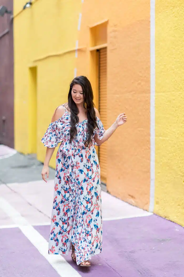 I love how easy breezy this Tanya Taylor dress is, and it was perfect to wear for a little summer weekend getaway. We’re back from our long weekend trip to Vancouver and despite all the smoke and haze from the wildfires in Canada, we had a great time exploring the city. There were a lot of things about Vancouver that reminded me of San Francisco, and of course I’ll be writing up a travel guide based on our trip soon. When I saw this colorful alley right across the street from our hotel, I was so excited to do an outfit shoot there. The alley was a BYOB (Bring Your Own Ball) play area with lines painted for different areas, and the colors just reminded me of being a kid. Maybe because they made me think of Laffy Taffy, which I never actually liked (you know I’m all about that chocolate), but always seemed to get a ton of when I went trick-or-treating. The purple wall ball court was my personal fav, and made me reminisce about how competitive my friends and I used to get playing handball in elementary school. Because, you know, wall ball is life. At least, it is when you’re nine.