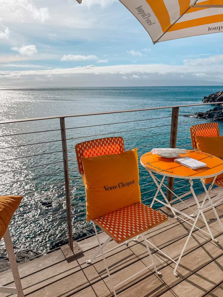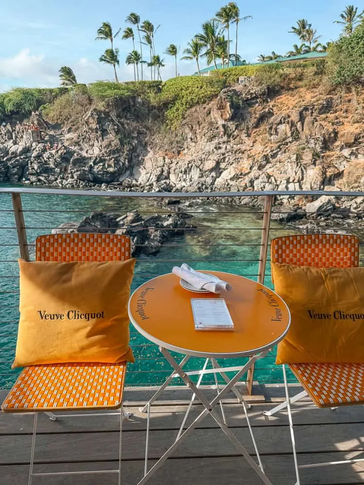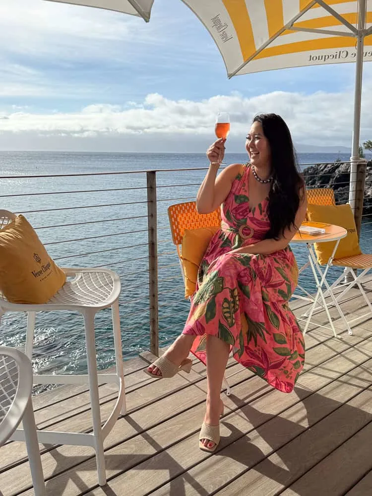 Another must-do is the Champagne Hale at Cliff House, the Montage’s exclusive Veuve Clicquot champagne bar. Perched on the cliffs overlooking Kapalua Bay, it’s the ultimate spot to watch the sunset while sipping bubbly and enjoying light bites. The vibe is upscale yet relaxed, with breathtaking panoramic views of the ocean and Moloka‘i in the distance. It’s the kind of experience that makes you stop, soak it all in, and feel completely spoiled in paradise.