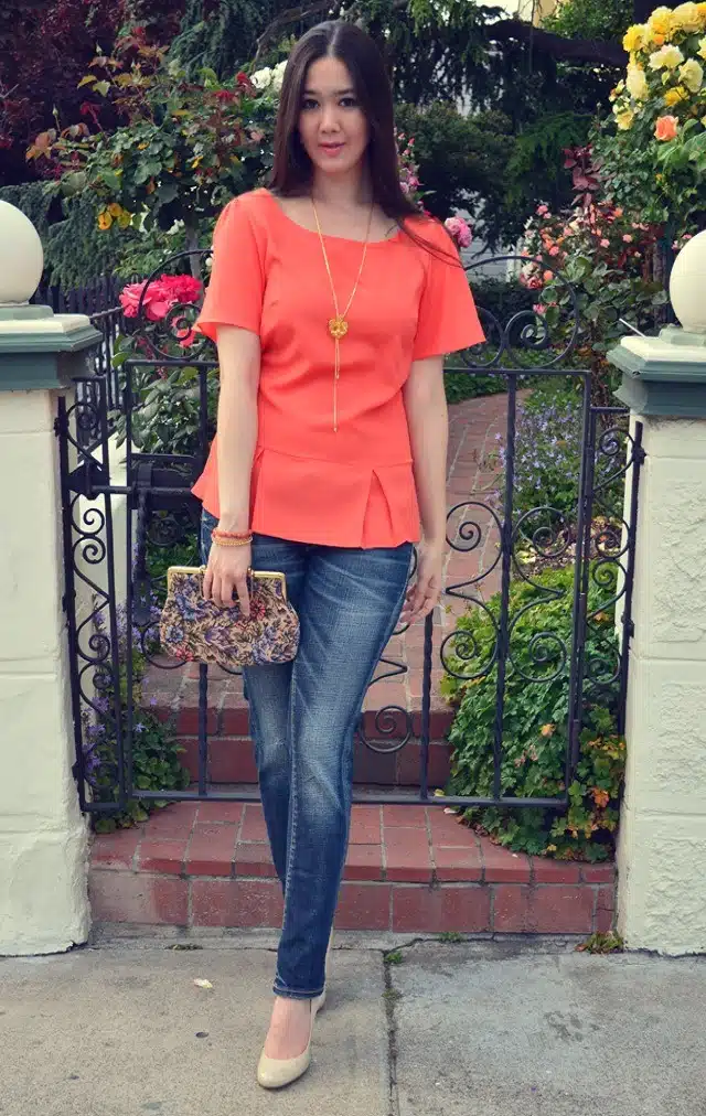So clearly I had to try the peplum trend at some point in time. And you know what? It is really flattering. Now I see why peplum tops have been so hot over the last year. I thought my grandmother’s floral clutch went perfectly with the orange top and the flowery background. *Sigh* I dream of the day that I’ll have a pretty frontyard with roses. Not happening in my SF lifetime though!