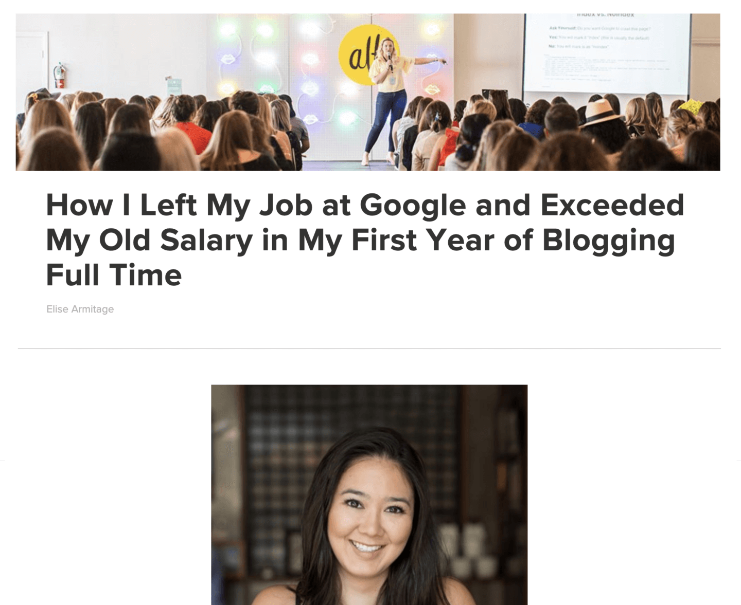 Elise spoke at Alt Summit 2020, discussing the details of how she was able to exceed her old salary at Google during her first year of blogging full-time.