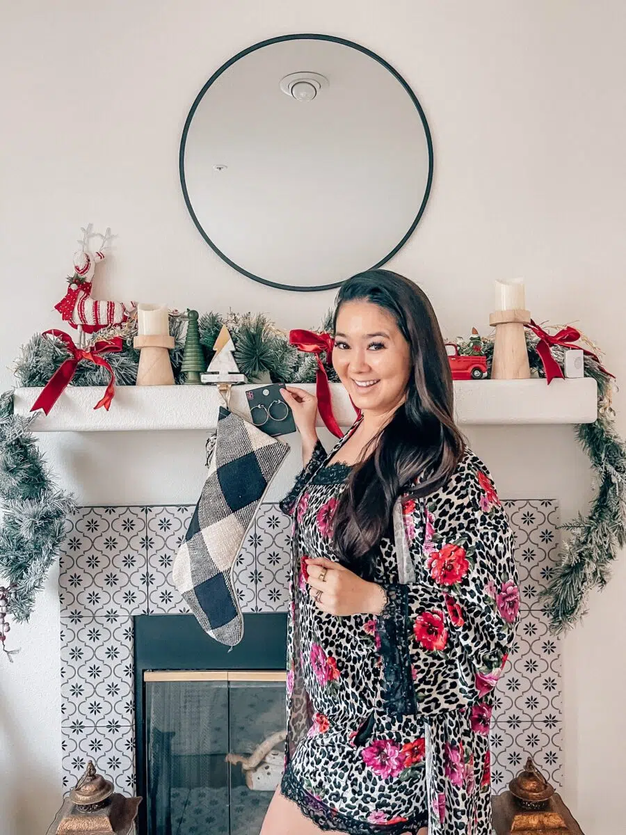 One of the most fashionable and functional stocking stuffers available on Walmart is this robe, cami, and shorts set by Sofia Vergara that I’m wearing. This $23 pajama set is an irresistibly cute and cozy velvet outfit. It’s the perfect sleep attire for cuddling up with a holiday movie and a cup of hot cocoa.