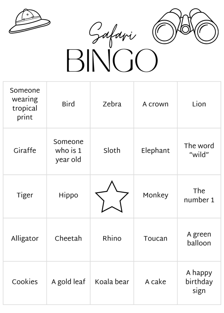 My favorite game that I came up with was Safari Bingo! I made this Safari Bingo on Canva and put a bunch of animals and other things I could think of that I knew would be out and around at the party, gave the kids some animal stickers, and they went wild! Be sure to have a prize, that was the first thing one of the girls asked was if there was a prize lolol I was like of course there’s a prize, what do you take me for??